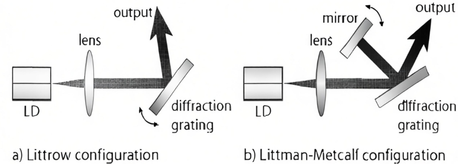ເລເຊີຫຼັກຢູ່ຕາມໂກນສັ້ນເຊັ່ນ DFB ແລະ DBR ມີການຈຳກັດເວລາປະຕິສໍາພັນຂອງ photon ພາຍໃນຊ່ອງ, ເຮັດໃຫ້ການບີບອັດເສັ້ນເລິກຍາກ. ເພື່ອເພີ່ມຄວາມກວ້າງຂອງເສັ້ນ ແລະ ສະກັດກັ້ນສຽງລົບກວນ, ການຕັ້ງຄ່າຄາບທໍ່ຫຼັກຂອງຊ່ອງສັ້ນດັ່ງກ່າວມັກຈະຖືກລວມເຂົ້າກັບໂຄງສ້າງທາງນອກເພື່ອເພີ່ມປະສິດທິພາບການເຮັດວຽກ. ໂຄງສ້າງທາງນອກທົ່ວໄປລວມເຖິງຢູ່ຕາມໂກນທາງນອກທາງກວ້າງຂອງພື້ນ, ເສັ້ນໄຍພາຍນອກຢູ່ຕາມໂກນ, ແລະຢູ່ຕາມໂກນທາງນອກຂອງຄື້ນ. ກ່ອນທີ່ຈະພັດທະນາອຸປະກອນໃຍແກ້ວນໍາແສງແລະໂຄງສ້າງຂອງ waveguide, ຢູ່ຕາມໂກນພາຍນອກແມ່ນສ່ວນໃຫຍ່ແມ່ນປະກອບດ້ວຍ optics spatial ສົມທົບກັບອົງປະກອບ optical ແຍກ. ໃນບັນດາສິ່ງເຫຼົ່ານີ້, ໂຄງສ້າງຕໍານິຕິຊົມທາງກວ້າງຂອງຊ່ອງພາຍນອກ-ຢູ່ຕາມໂກນສ່ວນຫຼາຍແມ່ນໃຊ້ການອອກແບບ Littrow ແລະ Littman, ໂດຍປົກກະຕິປະກອບດ້ວຍຊ່ອງສຽບເລເຊີ, ເລນຄູ່, ແລະ grating ການແຜ່ກະຈາຍ. grating, ເປັນອົງປະກອບຄໍາຄຶດຄໍາເຫັນ, ເຮັດໃຫ້ການປັບຄວາມຍາວຄື້ນ, ການເລືອກຮູບແບບ, ແລະການບີບອັດ linewidth.