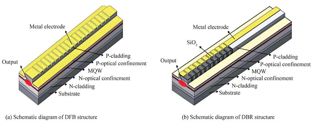 ສິ່ງທ້າທາຍດ້ານວິຊາການຂອງເລເຊີ DFB ແມ່ນຢູ່ໃນການຜະລິດໂຄງສ້າງ grating. ມີສອງວິທີການຕົ້ນຕໍສໍາລັບການ grating fabrication ໃນ lasers semiconductor DBR: epitaxy ທີສອງແລະການ etching ດ້ານ. Regrown grating feedback (RGF)-DFB semiconductor lasers ນຳໃຊ້ epitaxy ຂັ້ນສອງ ແລະ photolithography ເພື່ອຂະຫຍາຍຊຸດຂອງ gratings ດັດຊະນີການສະທ້ອນແສງຕໍ່າໃນພາກພື້ນທີ່ເຄື່ອນໄຫວ. ວິທີການນີ້ຮັກສາໂຄງສ້າງຊັ້ນທີ່ມີການເຄື່ອນໄຫວທີ່ມີການສູນເສຍຕ່ໍາ, ອໍານວຍຄວາມສະດວກໃນການຜະລິດເຄື່ອງສະທ້ອນສຽງ Q ສູງ. Surface grating (SG)-DFB semiconductor lasers ມີສ່ວນຮ່ວມໂດຍກົງ etching ຊັ້ນ grating ເທິງຫນ້າດິນຂອງພາກພື້ນທີ່ມີການເຄື່ອນໄຫວ. ວິທີການນີ້ແມ່ນສະລັບສັບຊ້ອນຫຼາຍ, ຮຽກຮ້ອງໃຫ້ມີການປັບຕົວທີ່ຊັດເຈນຕາມວັດສະດຸພາກພື້ນທີ່ມີການເຄື່ອນໄຫວແລະ doping ions, ແລະສະແດງໃຫ້ເຫັນການສູນເສຍທີ່ສູງຂຶ້ນ, ແຕ່ສະຫນອງການກັກຂັງ optical ທີ່ເຂັ້ມແຂງແລະຄວາມສາມາດໃນການສະກັດກັ້ນຮູບແບບທີ່ສູງຂຶ້ນ.